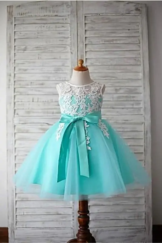 Blue Ball Gown Scoop Sleeveless Bowknot Floor-Length Tulle Appliques Flower Girl Dresses DM722