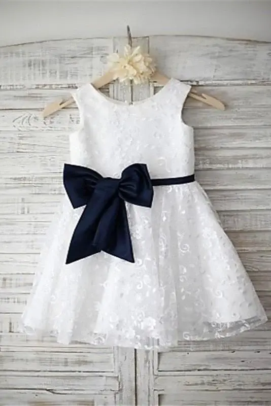 A-line Scoop Sleeveless Bowknot Floor-Length Lace Flower Girl Dresses With Navy Sash DM723