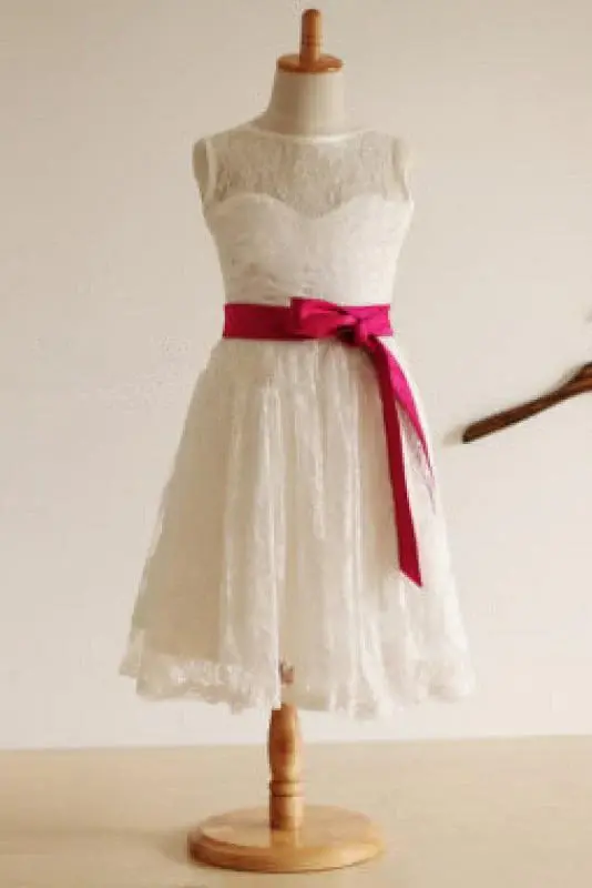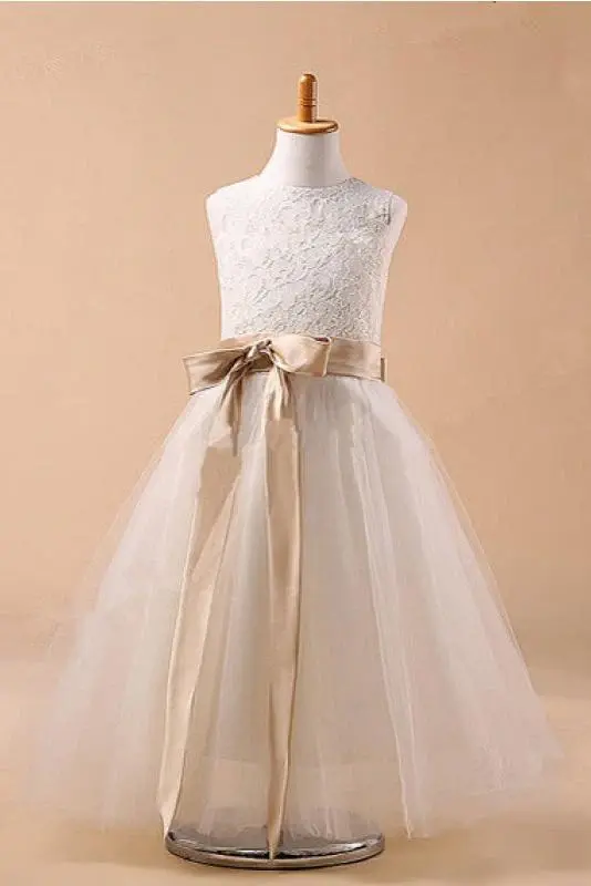 Ivory Bateau A-line Princess Sleeveless Long Lace Flower Girl Dress With Sash DM701