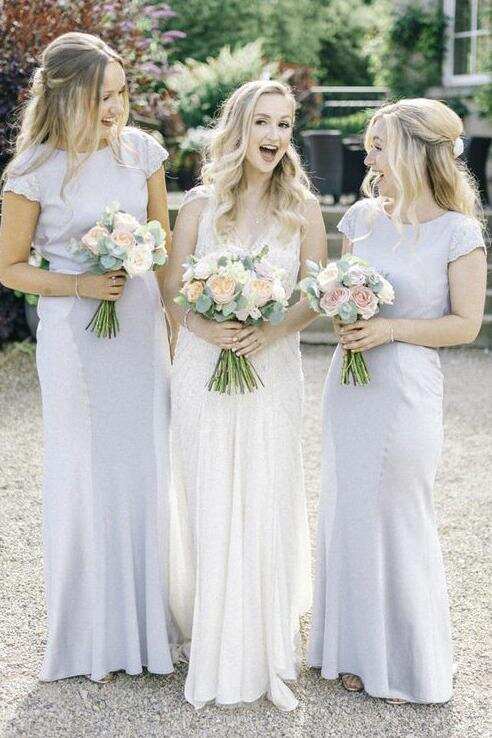 New Arrival Sheath Bateau Cap Sleeves Floor-Length Stain Bridesmaid Dress with Lace DM653