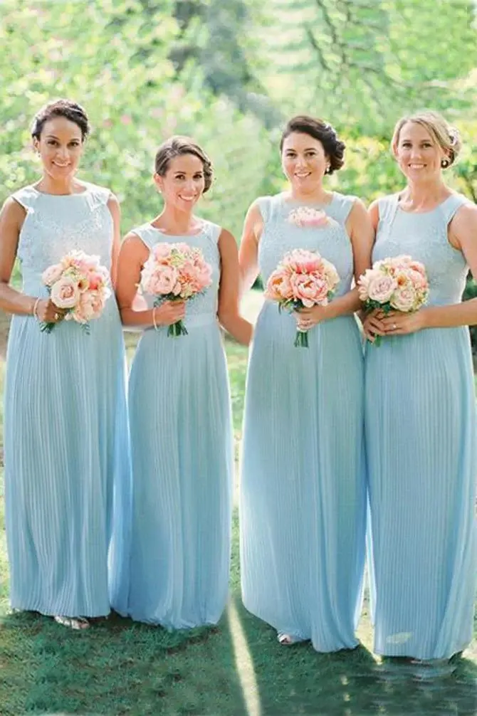 Cheap A-Line Bateau Sleeveless Light Sky Blue Chiffon Aline Long Bridesmaid Dress with Lace DM654