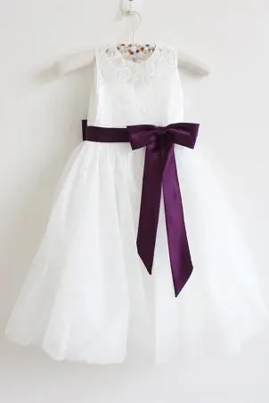 Light Ivory Lace Tulle Sleeveless Floor-length Flower Girl Dress With Eggplant Sash/Bows DM213