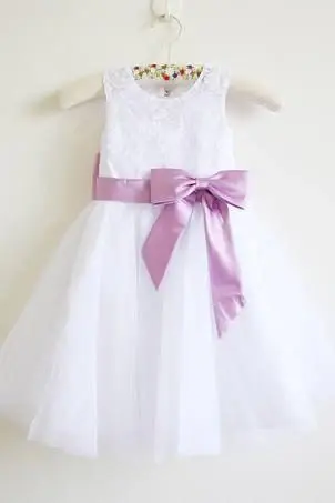 White Lace Lilac Baby Girls Dress, Tulle Flower Girl Dresses With Lilac Sash DM203