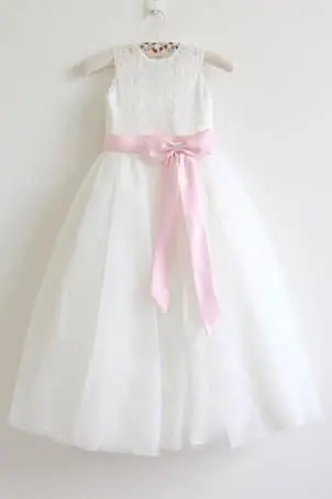 Ivory Lace Tulle Ivory Flower Girl Dress With Pink Sash/Bows Sleeveless Floor-length DM207