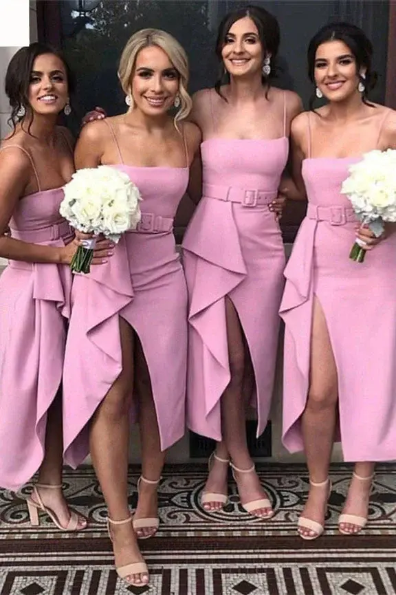 A Line Satin Pink High Low Length Leg Slit Bridesmaid Dresses With Belt DM1839