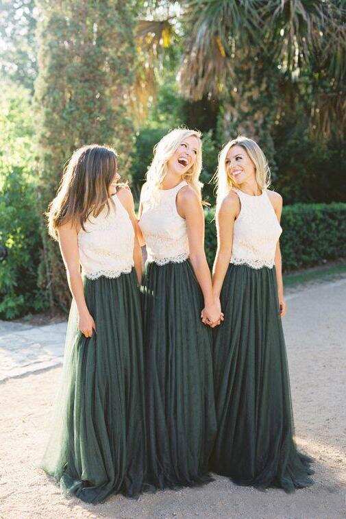 Modest Forest Green Tulle Ivory Lace Top Bridesmaid Dresses DMB97