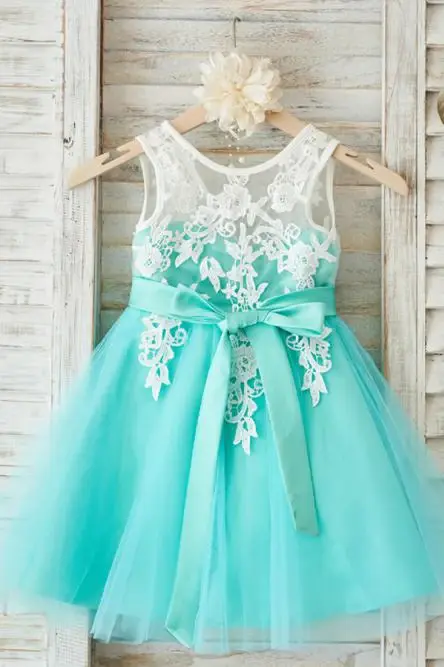 A-Line Round Neck Mint Tulle Flower Girl Dress with Appliques DMP27