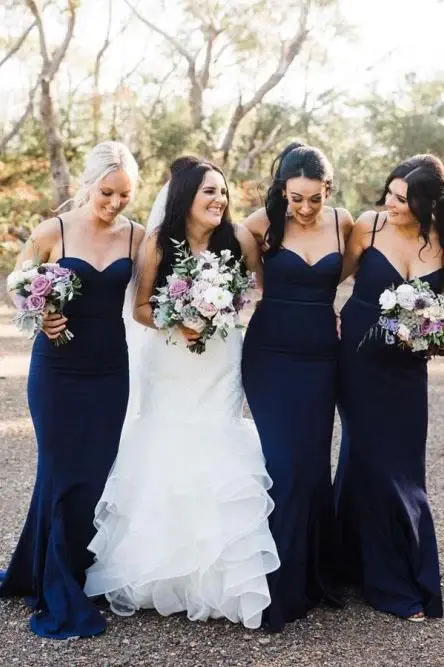 Mermaid Spaghetti Straps Sweep Train Navy Blue Long Bridesmaid Dress DMR25
