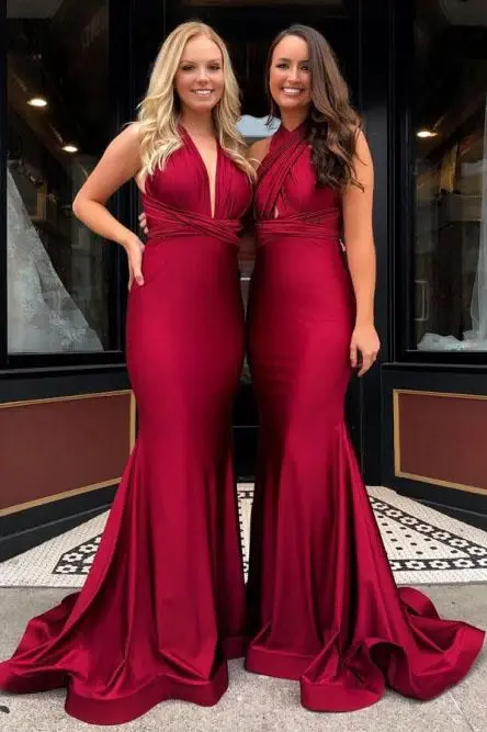 Mermaid V-Neck Burgundy Long Convertible Prom Bridesmaid Dress DMR23