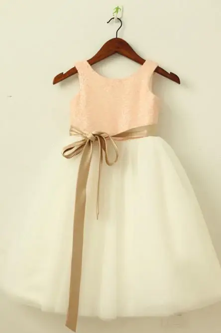 A-Line Round Neck Ivory Flower Girl Dress with Sequins Sash DMP23