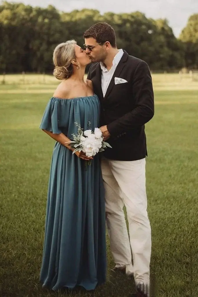 A-line Sky Blue Long Bridesmaid Dress, Off Shoulder Chiffon Long Prom Dress DMO81