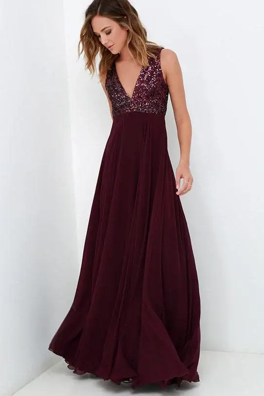 Burgundy Bridesmaid Dresses WIth Sequin Top, A-line Long Chiffon Wedding Party Dress DMO80