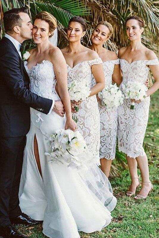 Elegant Off the Shoulder White Lace Tea Length Bridesmaid Dress DMN1