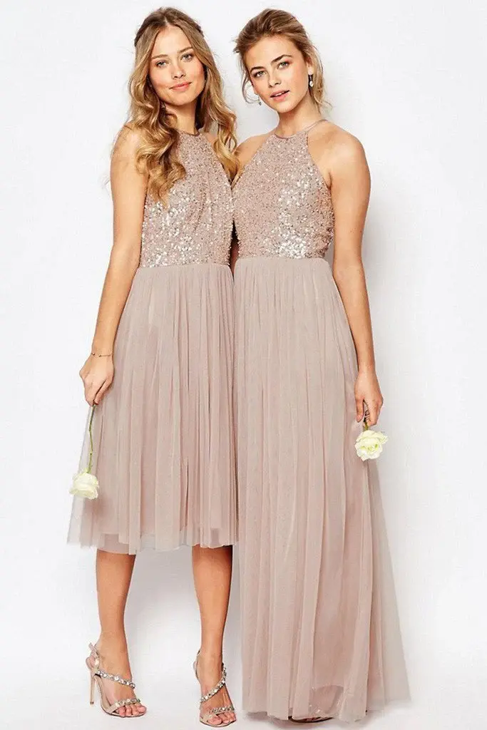Gorgeous Sequins Top Halter Romantic A Line Short Long Bridesmaid Dresses DMD60