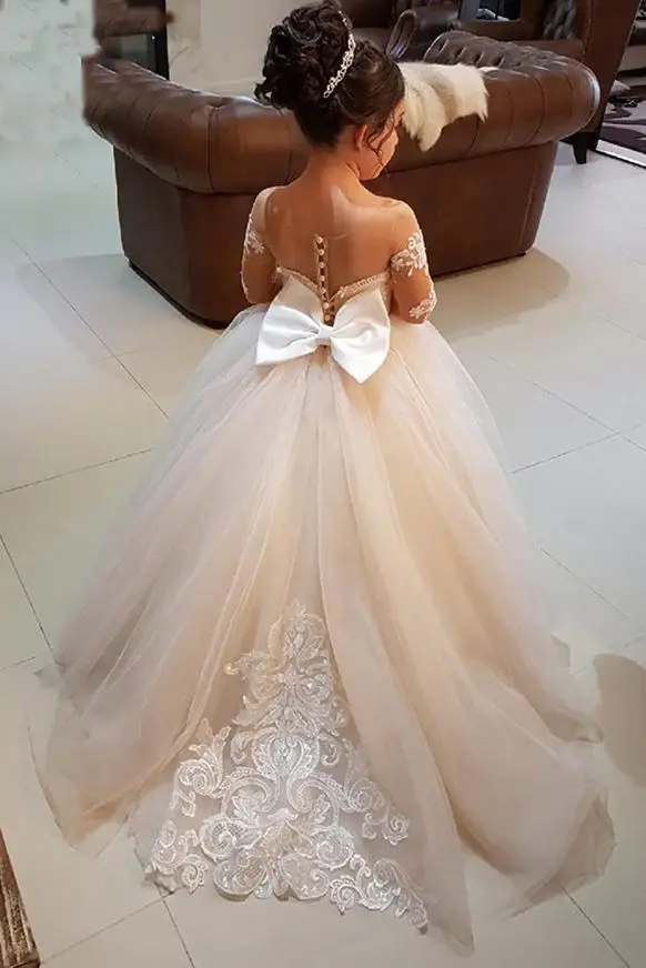 Princess Ball Gown Long Sleeves Tulle Long Flower Girl Dress with Lace Appliques DMB98