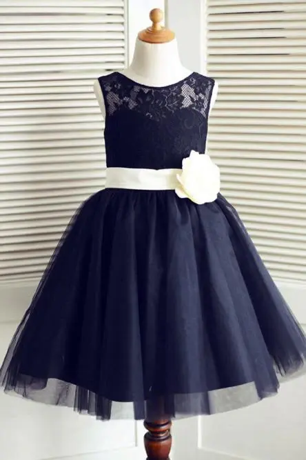 A-Line Round Neck Navy Blue Tulle Flower Girl Dress with Lace DMP18