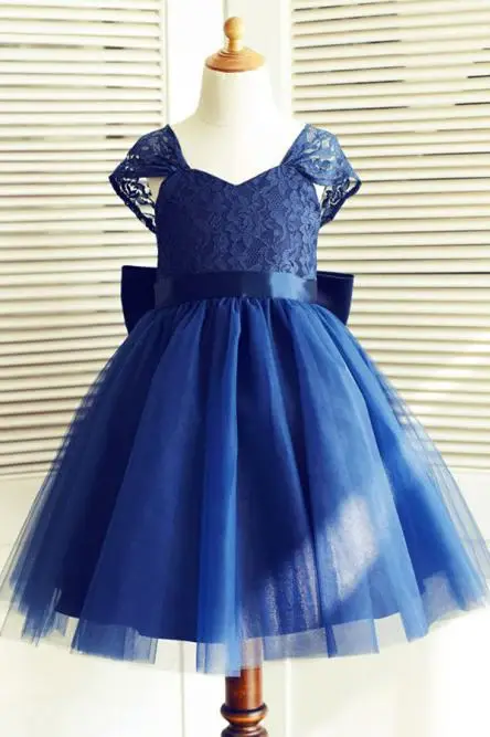A-Line Square Neck Cap Sleeves Dark Blue Flower Girl Dress with Lace Bowknot DMP16